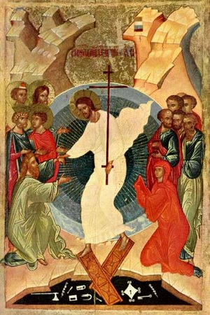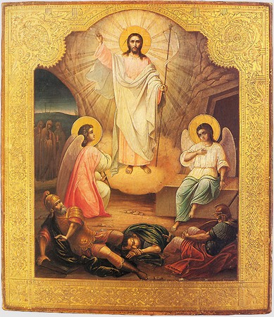 Приведенное нами описание иконы Сошествия во ад принадлежит иноку Григорию (Кругу), выдающемуся иконописцу Русского Зарубежья. Однако вместе с другим замечательным ученым и иконописцем, Л. Н. Успенским, инок Григорий считал, что из всех сюжетов Воскресения Христова, известных с раннехристианских времен, «единственно приличествующим является изображение жен-мироносиц у Гроба». Приведем здесь его размышления: