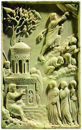 В правой верхней части рельефа изображена сцена Вознесения. Спаситель (Он изображен в виде безбородого юноши) поднимается по склону горы; навстречу Ему из облачного сегмента протянута десница Бога Отца. Чуть ниже, также на склоне горы — два апостола. Один из них благоговейно закрыл руками лицо и преклонил колени; другой в изумлении всплеснув руками, опускается на колени.