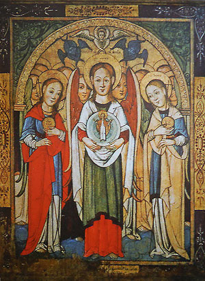 архангела зі сценами його діянь. Одним із найраніших уцілілих зразків цієї тематики є ікона другої половини XIV ст. «Архангел Михаїл з діяннями» із церкви св. Миколая у Сторонній, що виступає храмовою іконою. Зображення являє собою варіант святого в оточенні клейм, і є першою відомою іконою з клеймами в українському іконописі. Образ архангела представлено глибоко символічним, що було властиво архаїчним зразкам візантійського типу. Архангел зображений у статичній поставі на повен зріст у образі Божого Вістуна з мірилом у правій руці та блідо-рожевою сферою з ініціалами «ХС» – у лівій. Його лик наповнений особливою одухотвореністю та лагідністю, що прочитується у самозаглибленому спокійному погляді та стиснутих устах. Він випромінює рішучість і внутрішню силу, на це вказує й широка могутня шия. Обличчя обрамлене кучерявим акуратно вкладеним волоссям, що спадає на плечі. На його святість указує золочений німб, позначений контуром та прикрашений чотирипелюстковими розетками. Архангел зодягнутий на візантійську манеру – у коротку синьо-зелену туніку з оздобами по краях та довгий хітон оливково-зеленого кольору. Привертає увагу яскравий