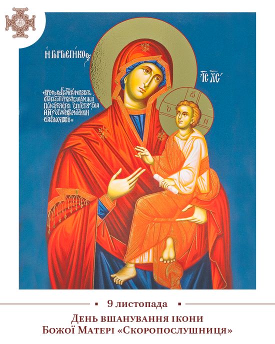 9 листопада за новоюліанським календарем Православна Церква вшановує ікону Божої Матері «Скоропослушниця». За переданням вона була написана в Х ст. Свою назву, відому нині всьому православному світові, ікона отримала у ХVIІ ст., коли від неї сталося чудо в Афонському монастирі, що зветься Дохіар.