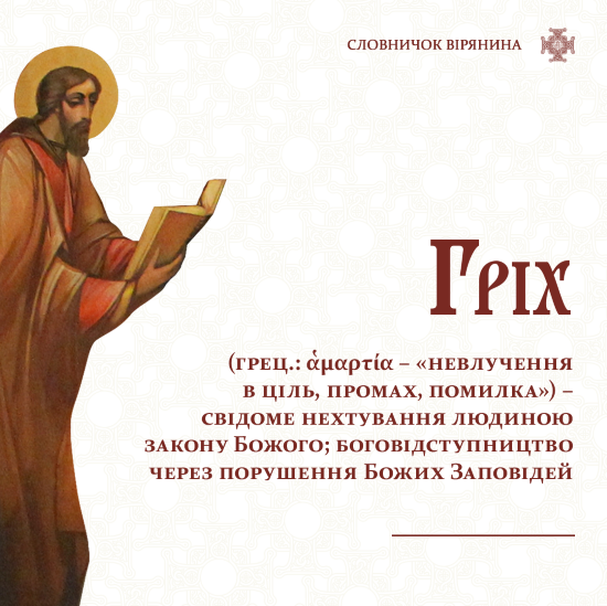 Що ж таке гріх? В перекладі з грецької слово «ἁμαρτία» буквально означає «невлучення в ціль, промах, помилка». Тобто, фактично, гріх і є тим хибним проявом людських можливостей, який не відповідає меті існування людини, суперечить її призначенню як творіння Божого. Адже людина, що була створена за образом Божим і яка наділена розумною душею, мусить шукати Мету, Причину і Джерело свого існування, тобто – прагнути богопізнання, досконалості та єднання з Господом.