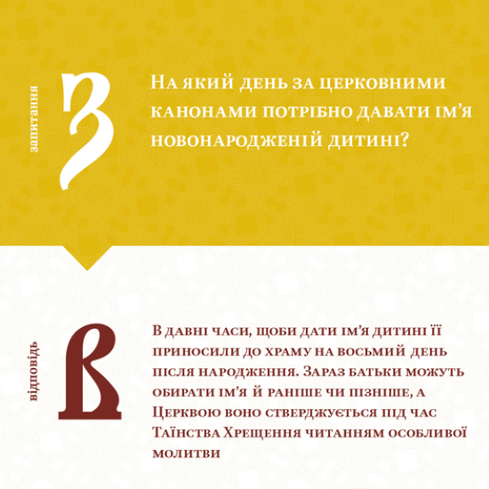 У давні часи, щоби дати ім’я дитині її приносили до храму на восьмий день після народження і це відбувалося ще до звершення над нею Таїнства Хрещення. Восьмий день символізує перевершення круговерті часу світу цього, нагадує про реалії вічного блаженного буття, причасниками якого ми стаємо, власне, через прийняття Таїнств Хрещення і Миропомазання.