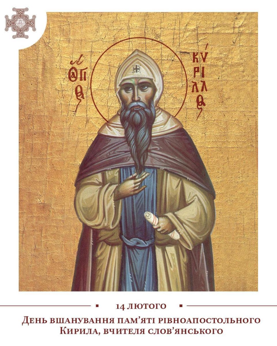 14 лютого Церква вшановує пам՚ять рівноапостольного Кирила, вчителя слов’янського, просвітителя. Жив він у другій половині IX століття, а рівноапостольним прославлений через те, що своїм служінням уподібнився до святих апостолів і трудів їхніх у благовісті віри Христової. Власне, як і його брат, рівноапостольний Мефодій.