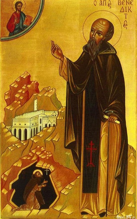 Св. Бенедикт – видатний патріарх західного чернецтва, покровитель мідників, вчителів, школярів та помираючих, спочив у 543 року. Він провістив свою смерть за шість днів до неї і велів приготувати могилу. На шостий день він попросив, щоб віднесли його до каплиці, де він причастився Тіла і Крові Господньої. Коли ж прийшла остання мить його життя, він підвівся, показуючи силу духу над тілесами, підніс до неба руки і зі словами молитви віддав Богові душу. У ту ж мить люди, що перебували в околицях обителі, побачили стежку, що пролягла від каплиці, де переставився святий, до неба.